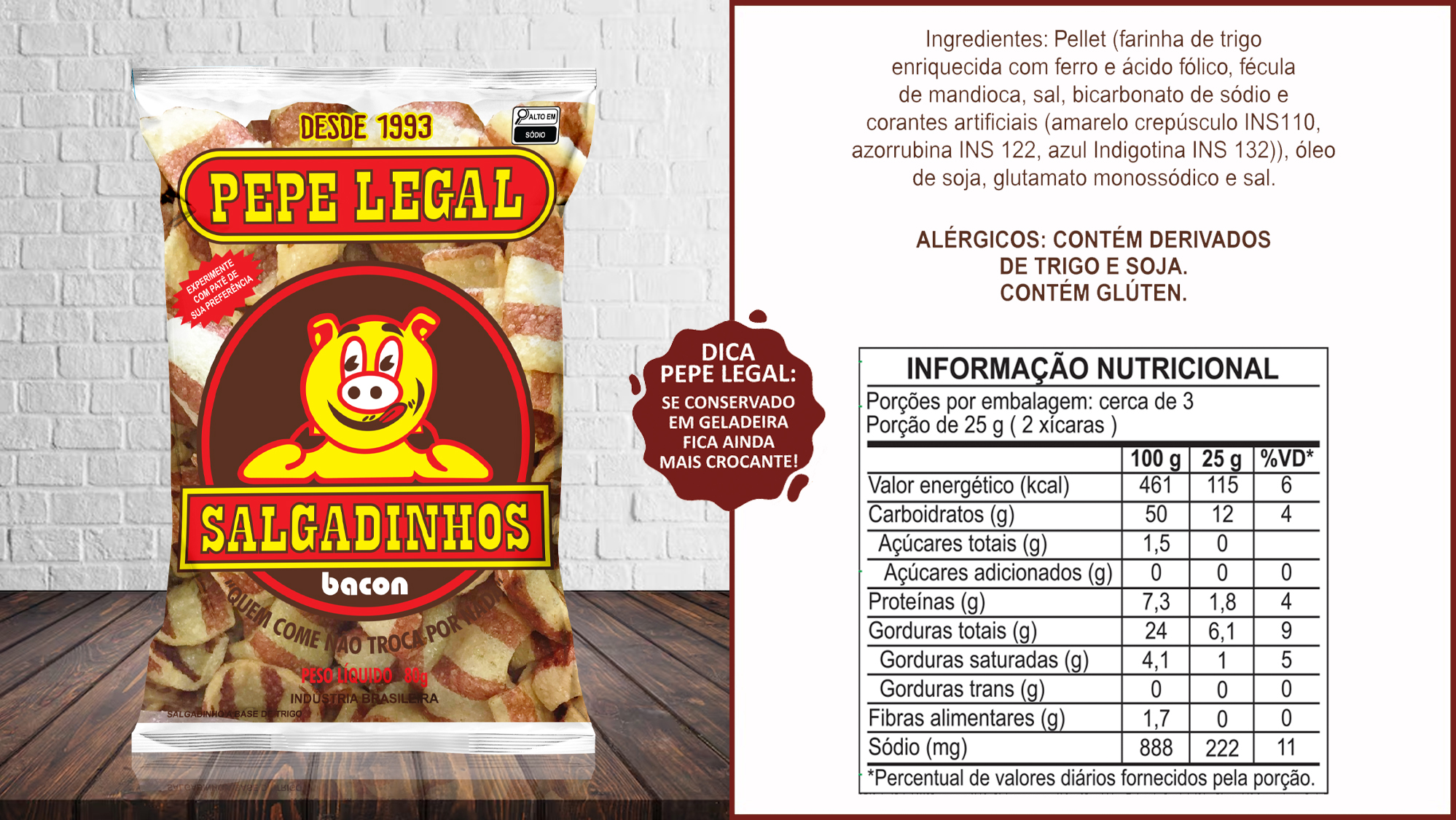 Ingredientes: Pellet (Farinha de Trigo enriquecida com ferro e ácido fólico, fécula de mandioca, sal, bicarbonato de sódio e corantes artificiais: amarelo crepúsculo INS 110, azorrubina INS 122, azul indigotina INS 132), óleo de soja e condimento cheddar com bacon (sal micronizado, glutamato monossódico e aroma idêntico ao natural).
