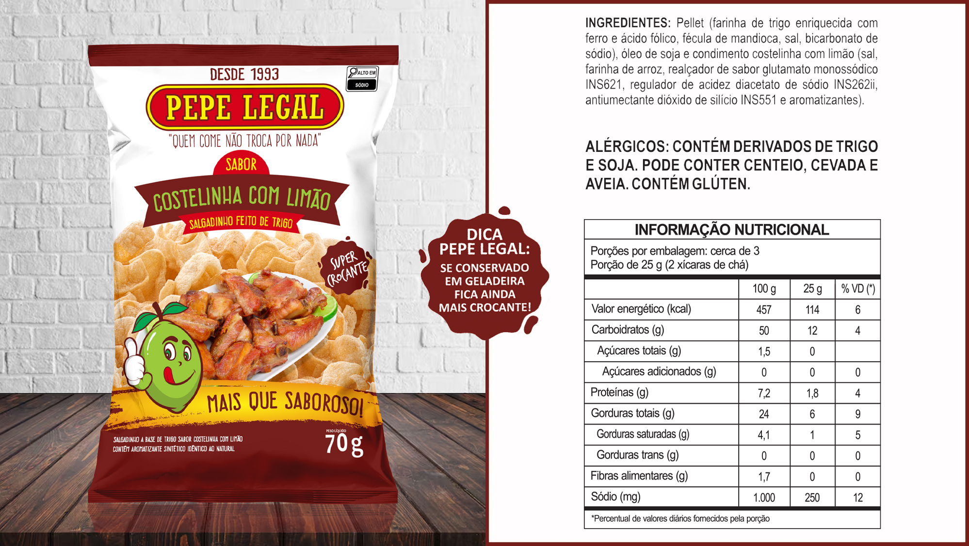Ingredientes: Pellet (Farinha de Trigo enriquecida com ferro e ácido fólico, fécula de mandioca, sal, bicarbonato de sódio), óleo de soja e condimento costelinha com limão (sal, farinha de arroz, realçador de sabor glutamato monossódico INS621, regulador de acidez diacetato de sódio ins262ii, antiumectante dióxido de silício INS551 e aromatizantes).