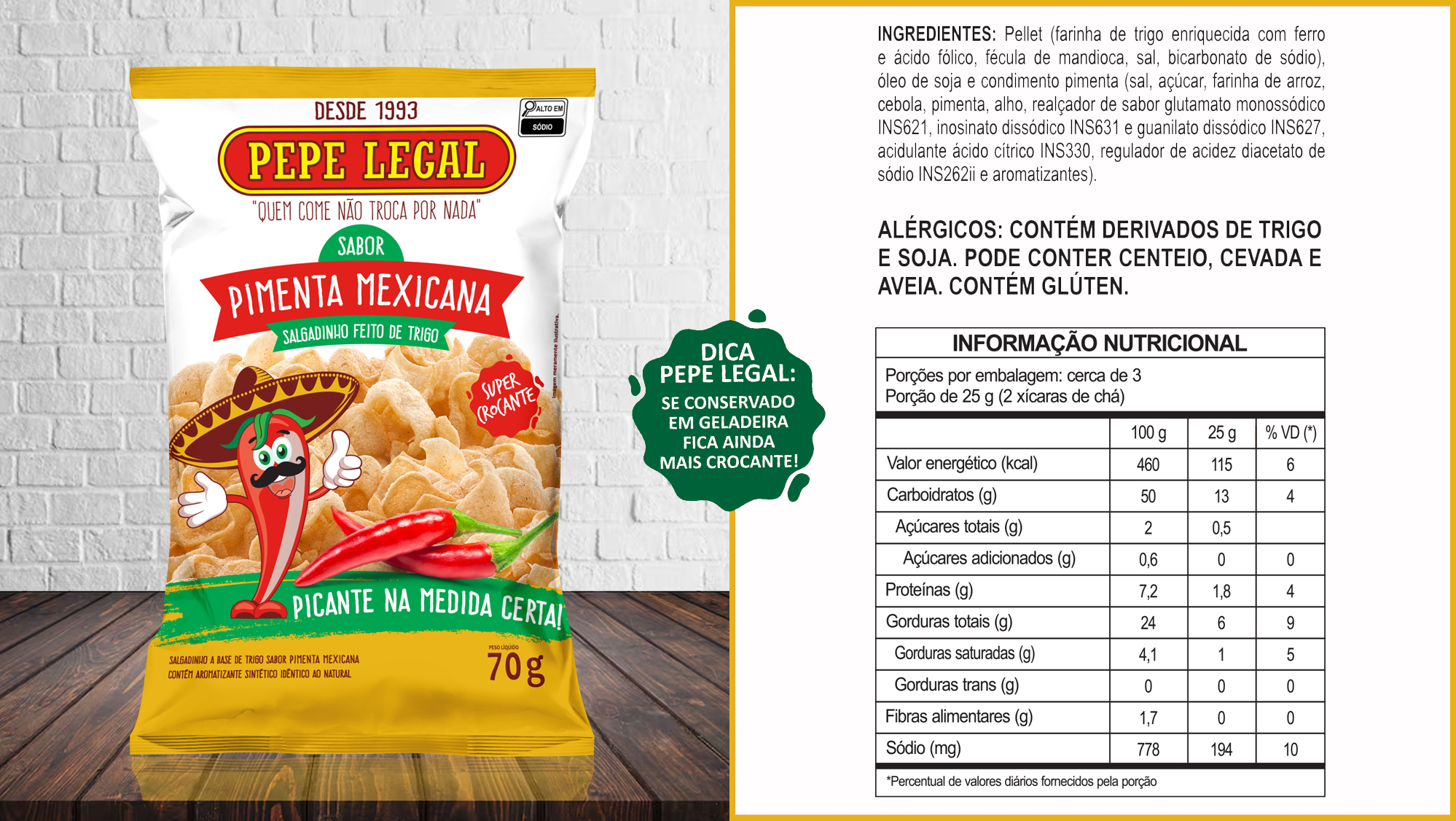 Ingredientes: Pellet (Farinha de Trigo enriquecida com ferro e ácido fólico, fécula de mandioca, sal, bicarbonato de sódio), óleo de soja e condimento pimenta (sal, açúcar, farinha de arroz, cebola, pimenta, alho realçador de sabor glutamato monossódico INS621, inosinato dissódico INS631 e guanilato dissódico INS627, acidulante ácido cítrico INS330, regulador de acidez diacetato de sódio INS262ii e aromatizantes).