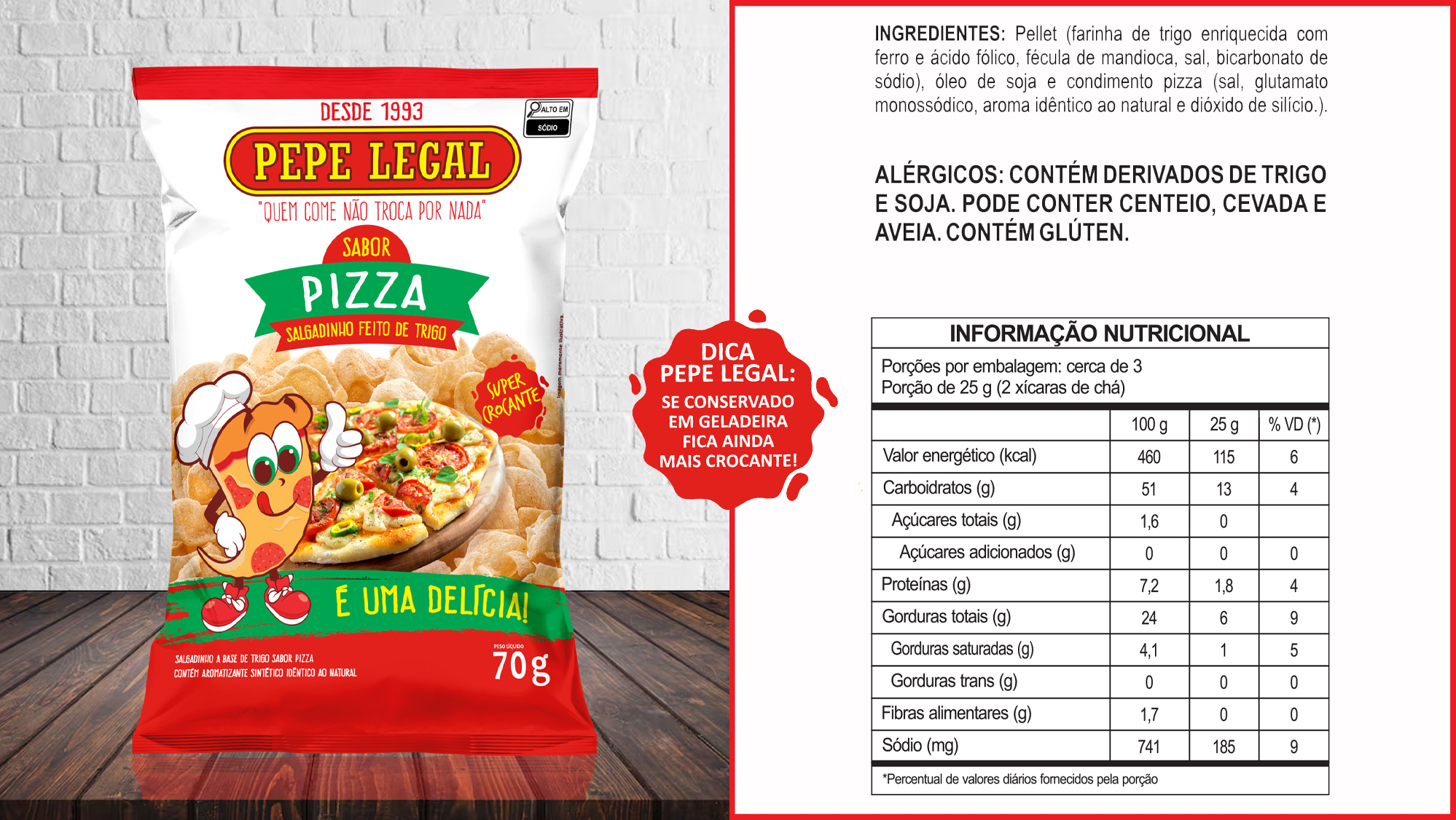 Ingredientes: Pellet (Farinha de Trigo enriquecida com ferro e ácido fólico, fécula de mandioca, sal, bicarbonato de sódio), óleo de soja e condimento pizza (sal, glutamato monossódico, aroma idêntico ao natural e dióxido de silício).